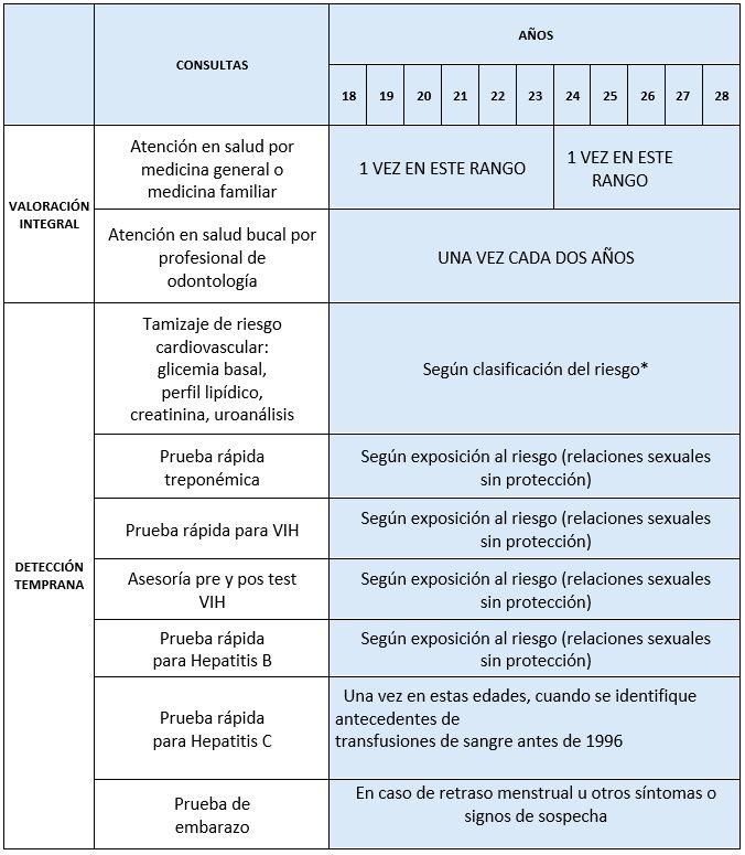 Este programa permite Detectar tempranamente los problemas de salud y situaciones vitales que afectan el desarrollo de la población entre los 18 y 28 años de edad, interviniendo factores de riesgo y potenciando factores protectores. Igualmente Promueve el auto cuidado, los factores protectores y el control de los factores de riesgo.